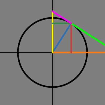 Commençons par montrer que les angles rouges et bleus sont les mêmes. On remarque en effet que les droites horizontales sont parallèles et que ces angles sont correspondants. On peut ainsi en déduire la relation
